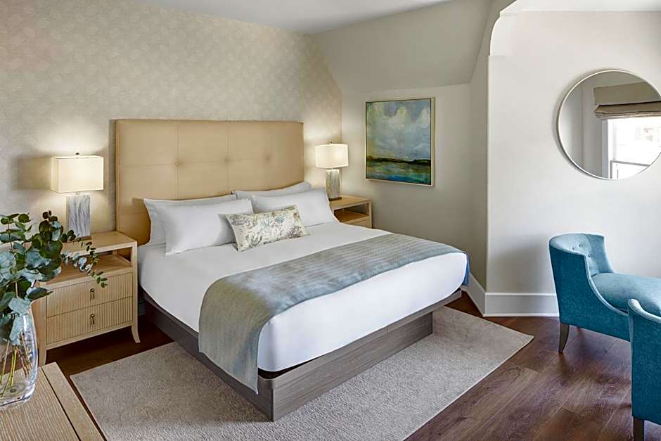 Also known as the "Deluxe Queen Guestroom" this room features a small private bathroom and view of the Monterey Bay from a window seat in a gable loft.